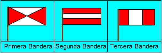 La primera bandera del Perú fue creada por el general Don José de San Martín, en Pisco, el 21 de Octubre de 1820. Esta bandera estaba dividida por dos diagonales en cuatro campos: Blancos, los del extremo superior e inferior y rojos los de los lados. La segunda bandera, surgió en mayo de 1822, esta nueva bandera constaba de 3 campos horizontales, los de los extremos superior e inferior rojo y el del centro blanco. La tercera bandera, es la que utilizamos en este momento, surgió en mayo de 1822, ya que la anterior se parecía mucho a la bandera de España, esta nueva bandera tiene 3 campos verticales, los extremos rojos y el centro blanco.