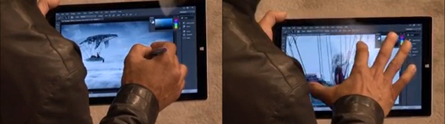 08:42am NY: Demostración del uso de Photoshop en la Surface Pro 3: "Poner todo el poder el Photoshop en un dispositovo de estos lo es todo". 08:40am NY: Mostrando las ventajas del uso con docking station. 08:36am NY: Demuestra la resistencia de la tablet cuando cae al piso.